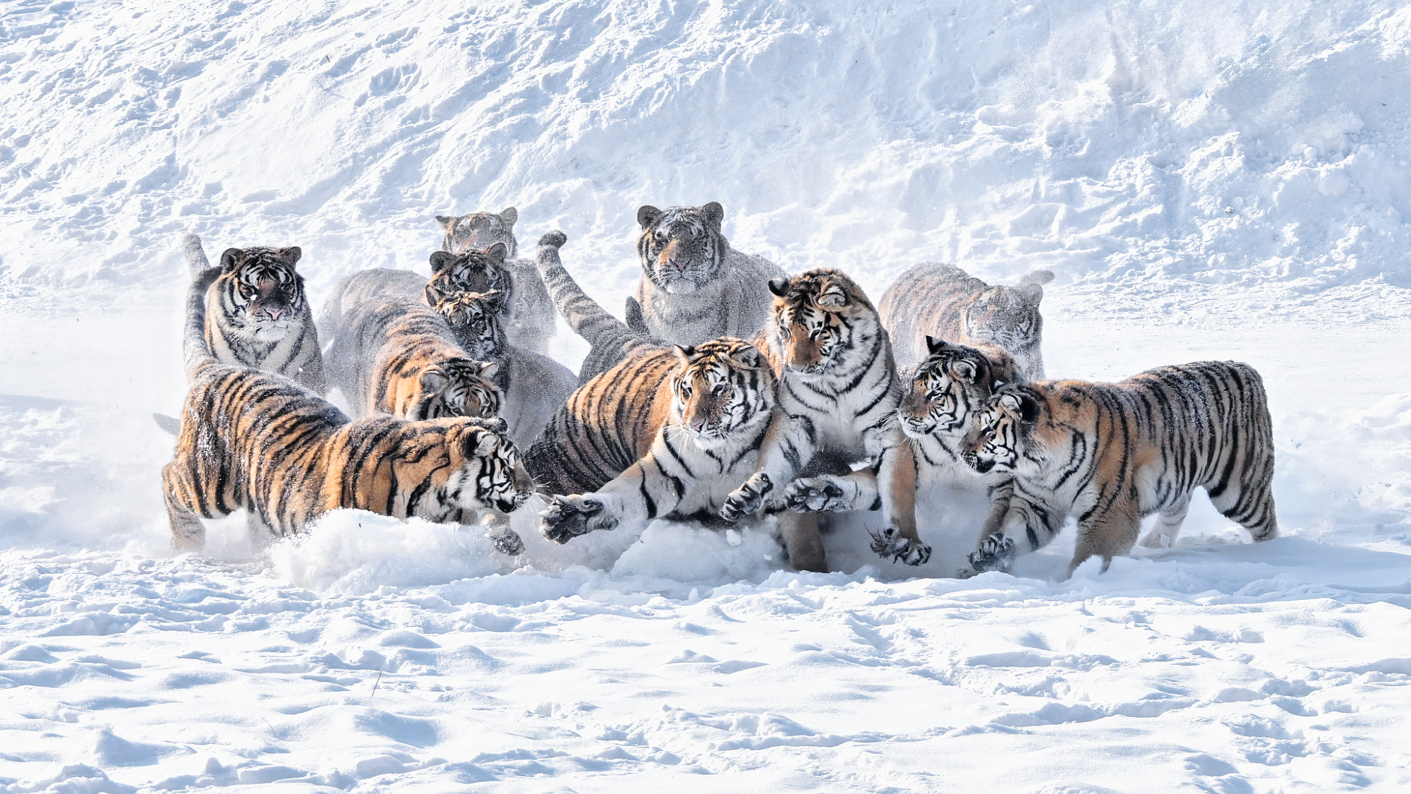 हेई लुंग च्यांग प्रांत के हेंगडाओहेज़ी टाइगर पार्क में साइबेरियाई बाघ बर्फ में खेलते हैं