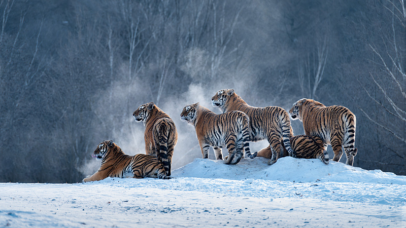 चीन के हेइलोंगच्यांग प्रांत के मुडानच्यांग शहर में हेंगताओहेज़ी टाइगर पार्क में साइबेरियाई बाघ बर्फ में दौड़ते हैं, बर्फ पर लेटते हैं और जानवरों के राजा की तरह व्यवहार करते हैं। उनके शक्तिशाली और दबंग उपस्थिति कई पर्यटकों को आकर्षित करती है जो उन्हें देखने आते हैं।