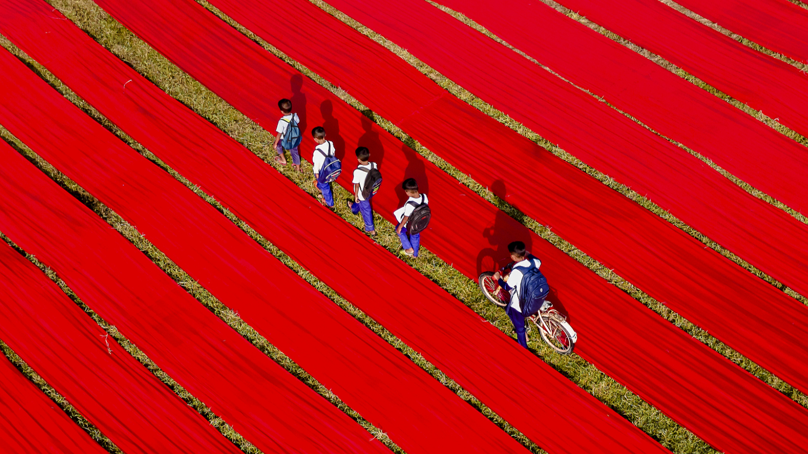 बांग्लादेश के ढाका में लाल कपड़े से ढके मैदान से होकर घर जाते स्कूली बच्चे