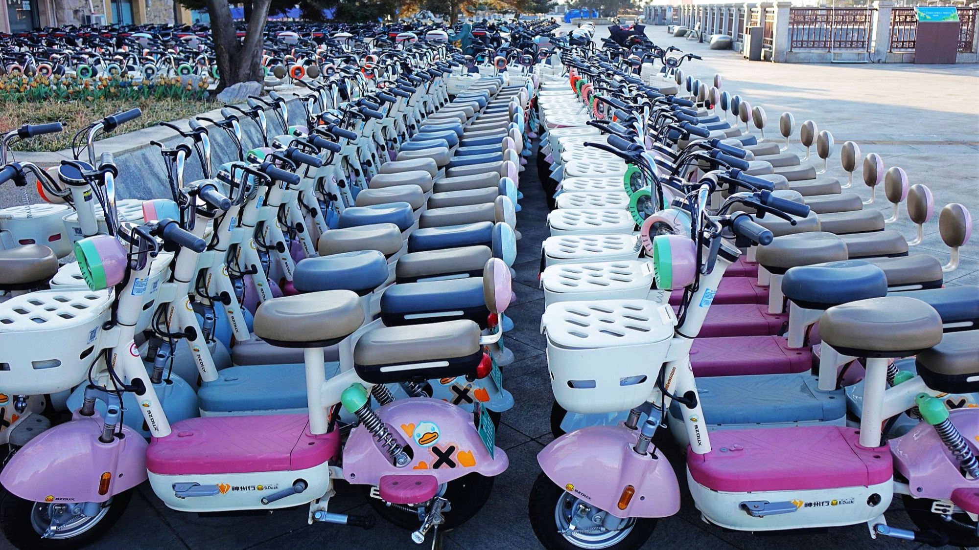 चीन के शानडोंग प्रांत के छिंगदाओ शहर के वेस्ट कोस्ट न्यू डिस्ट्रिक्ट में थांगदाओवान पैदल यात्री स्ट्रीट पर बड़ी संख्या में साझा इलेक्ट्रिक वाहन व्यवस्थित तरीके से पार्क किए गए हैं।
