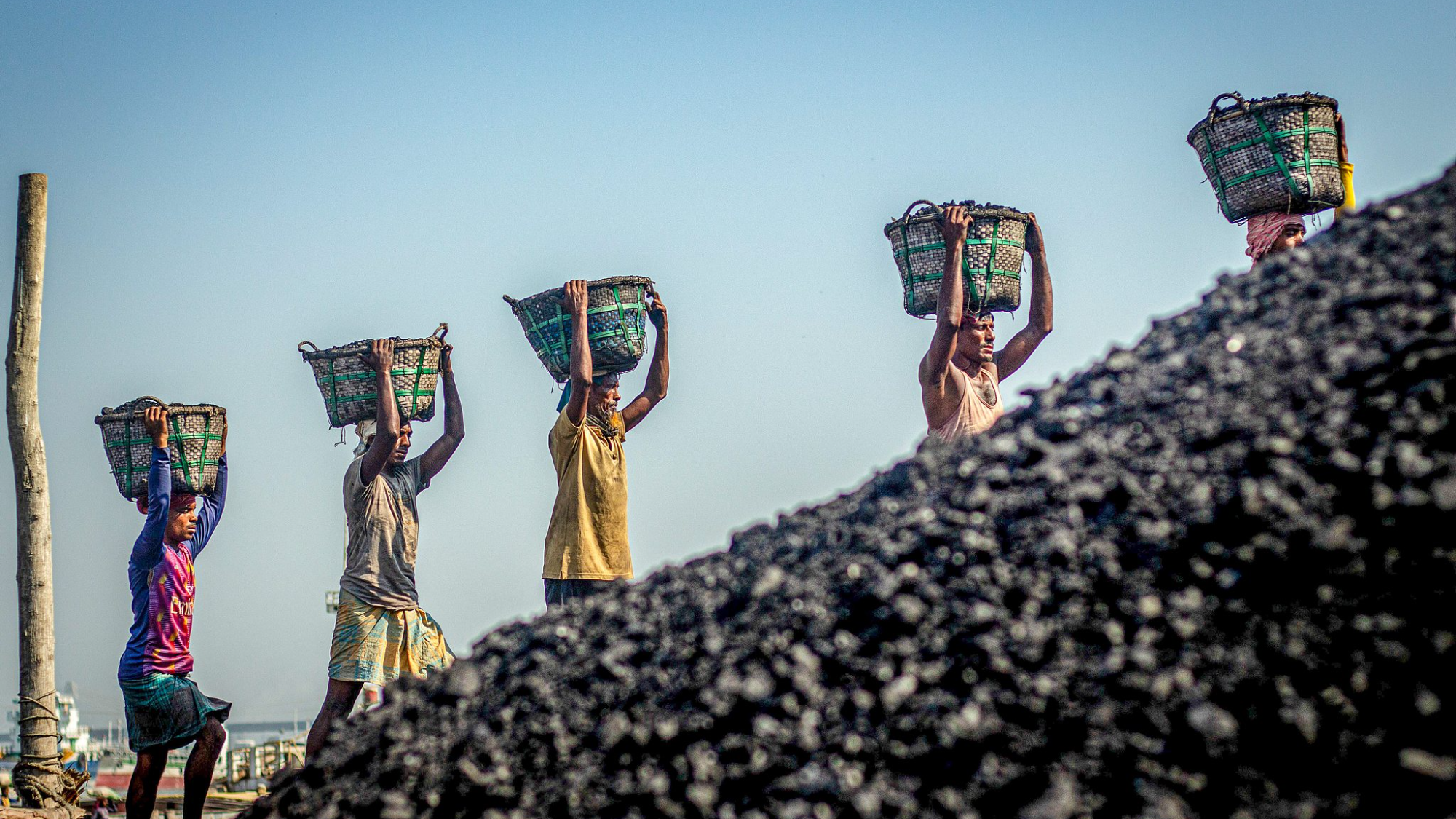 एक जहाज़ से कोयला और चूना पत्थर से भरी टोकरियाँ और बोरियाँ उतारते बांग्लादेशी श्रमिक