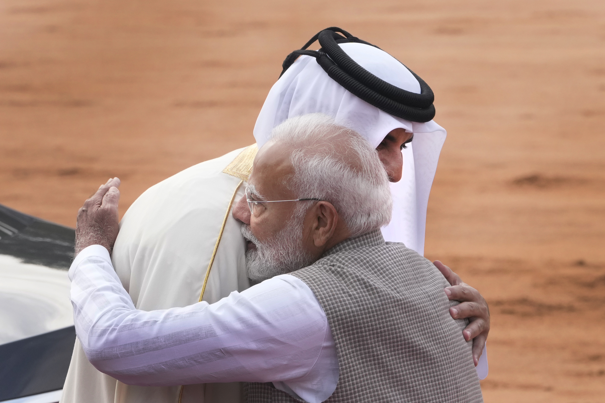 भारतीय प्रधानमंत्री नरेंद्र मोदी और कतर के अमीर तमीम ने एक-दूसरे को गर्मजोशी से गले लगाया