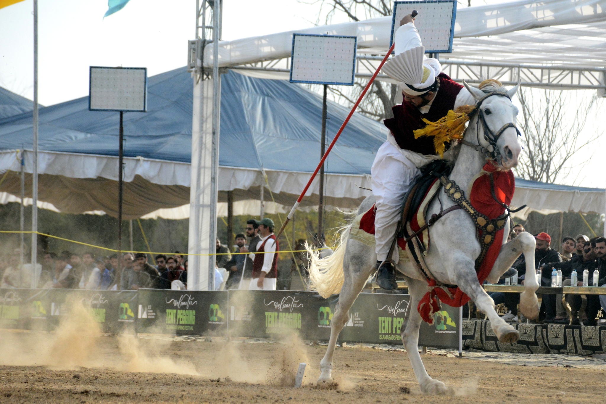 पाकिस्तान के इस्लामाबाद में वसंत के आगमन का जश्न मनाने के लिए घुड़सवारी प्रतियोगिता में भाग लेते घुड़सवार