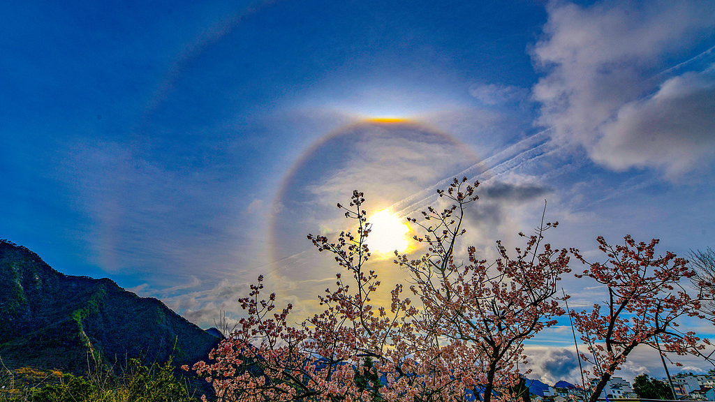 मंगलवार यानी 4 मार्च को पूर्वी चीन के चच्यांग प्रांत की राजधानी हांगचो शहर की छुनआन कांउटी के पहाड़ी इलाके में सूर्य के चारों ओर रंगीन इंद्रधनुष का अद्भुत नजारा देखने को मिला। इस नजारे को स्थानीय लोगों ने अपने कैमरे में कैद किया है। बता दें की सूर्य के चारों ओर इंद्रधनुषी चक्र एक तरह की वायुमंडलीय ऑप्टिकल घटना है। इसे‘22 डिग्री गोलाकार प्रभामंडल’भी कहा जाता है। क्योंकि सूर्य या चांद के चारों ओर बनने वाले इस गोले की त्रिज्या लगभग 22 डिग्री होती है। ये तब देखा जाता है जब सूर्य या चांद की किरणें बादलों में मौजूद हेक्सागोनल बर्फ़ के क्रिस्टल के माध्यम से विक्षेपित या अपवर्तित हो जाती हैं।