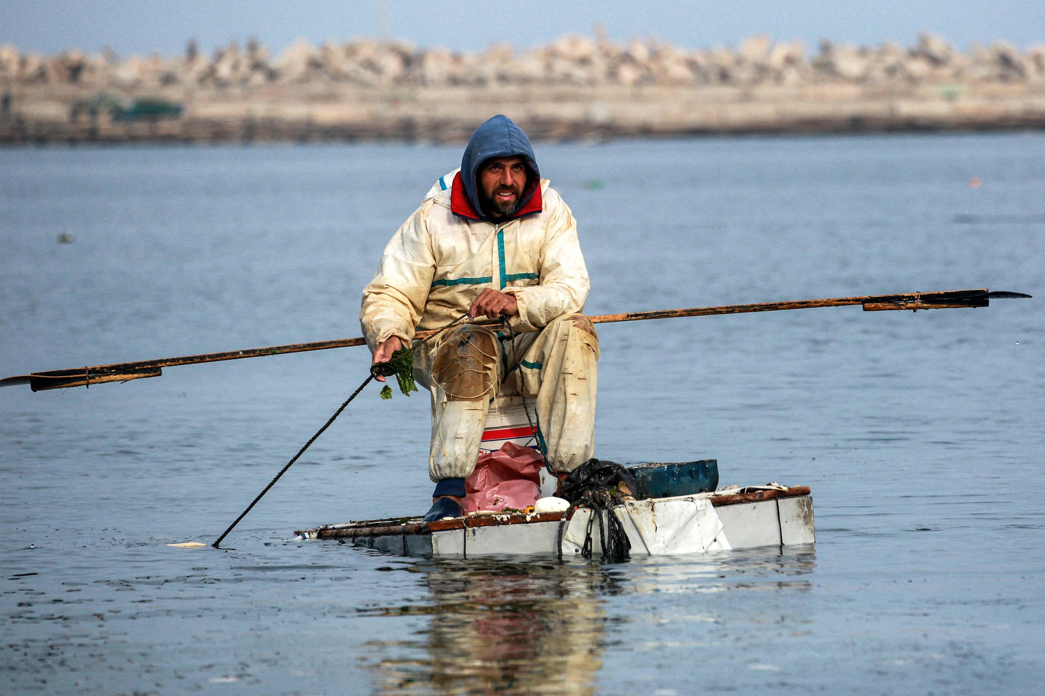 एक व्यक्ति रेफ्रिजरेटर से बनी नाव पर खड़ा है और मछली पकड़ने के लिए इसे अस्थायी नाव के रूप में इस्तेमाल कर रहा है। इजरायल-फिलिस्तीनी संघर्ष 15 महीने से ज़्यादा समय से चल रहा है। इजरायल की बमबारी ने बंदरगाह में मौजूद ज़्यादातर मछली पकड़ने वाली नावों को नष्ट कर दिया है, जिससे मछुआरों की आजीविका पर गंभीर असर पड़ा है।