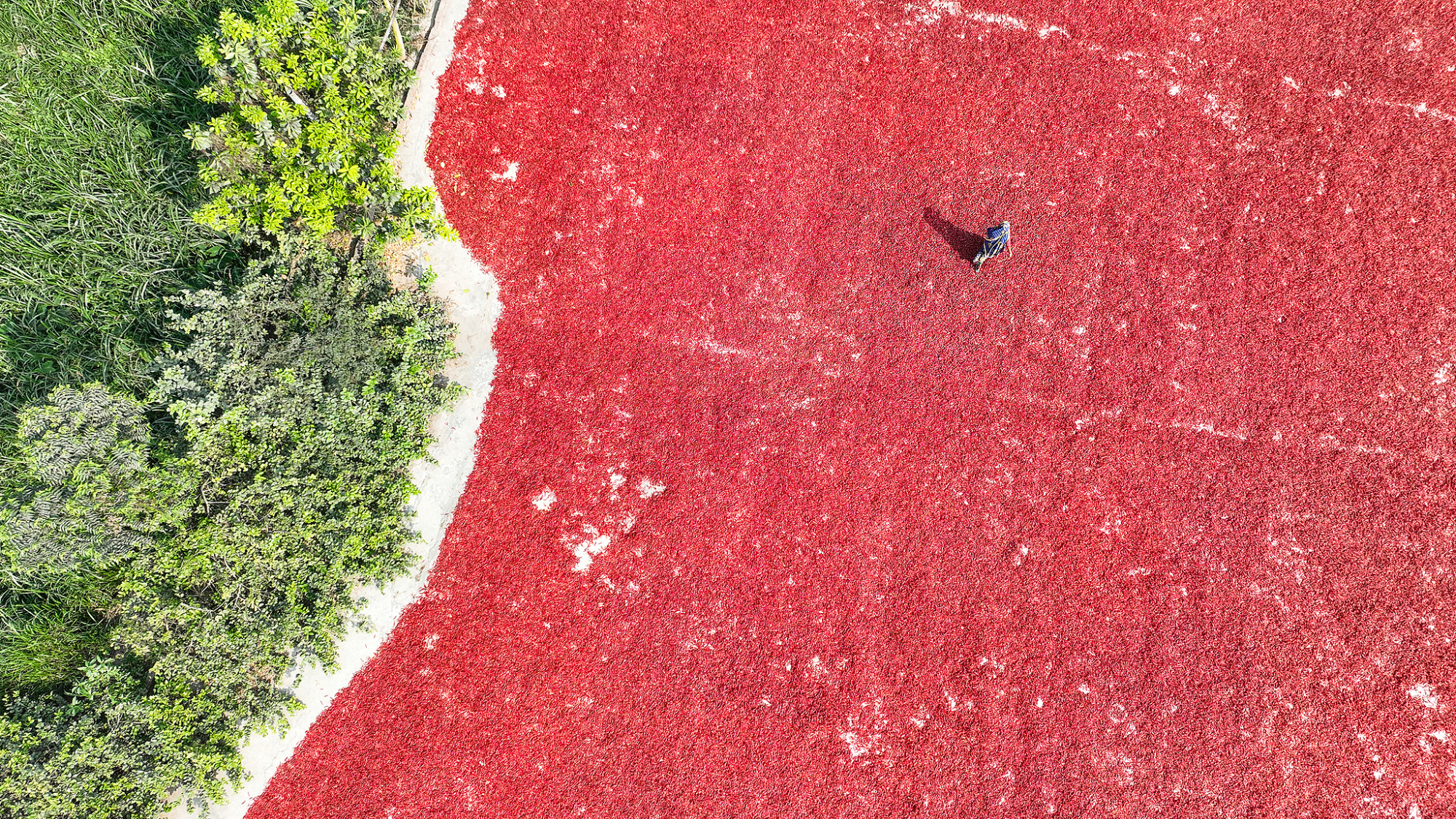 बांग्लादेश में किसान लाल मिर्च को धूप में सुखाते हैं, जिससे लाल कालीन जैसा चमकीला रंग बनता है।