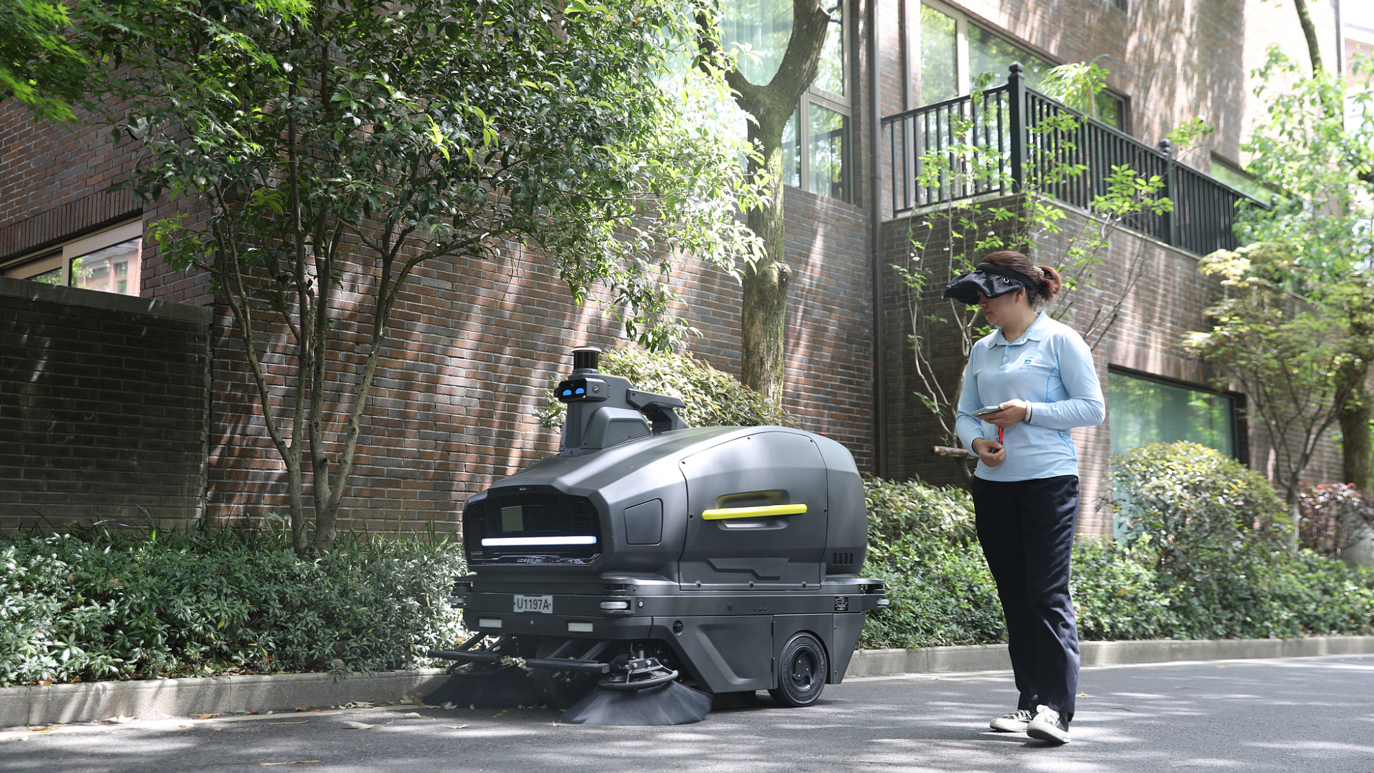 दक्षिण पूर्वी चीन के जेजियांग प्रांत के हांगजो शहर के एक आवासीय क्षेत्र में सफाई कर्मचारी गिरे हुए पत्तों को साफ करने के लिए एक बुद्धिमान रोबोट को नियंत्रित करने के लिए एक मिनी प्रोग्राम का उपयोग करते हैं।