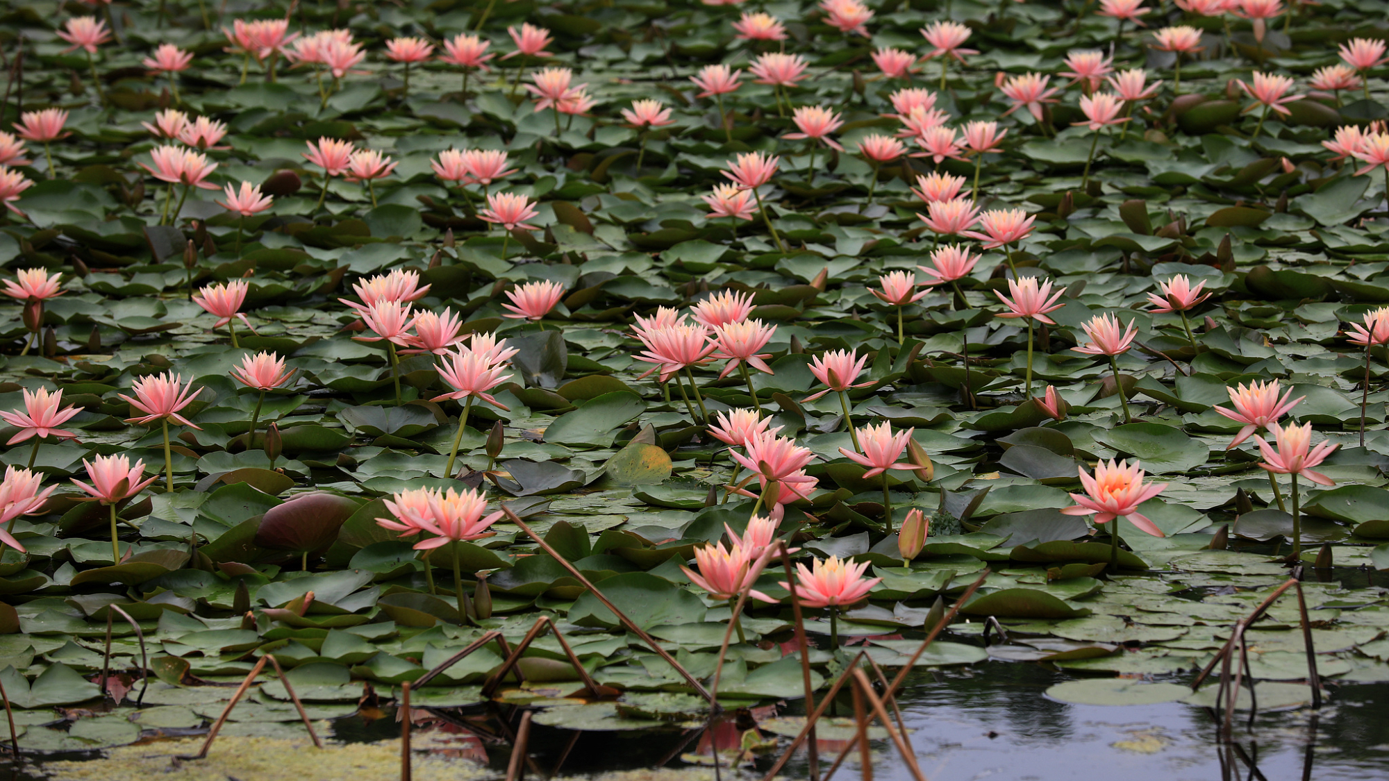 ज्यांग्सू प्रांत के हुआइआन शहर में खिले जल लिली के फूल पानी पर जलते लालटेन के जैसे दिखाई देते हैं।