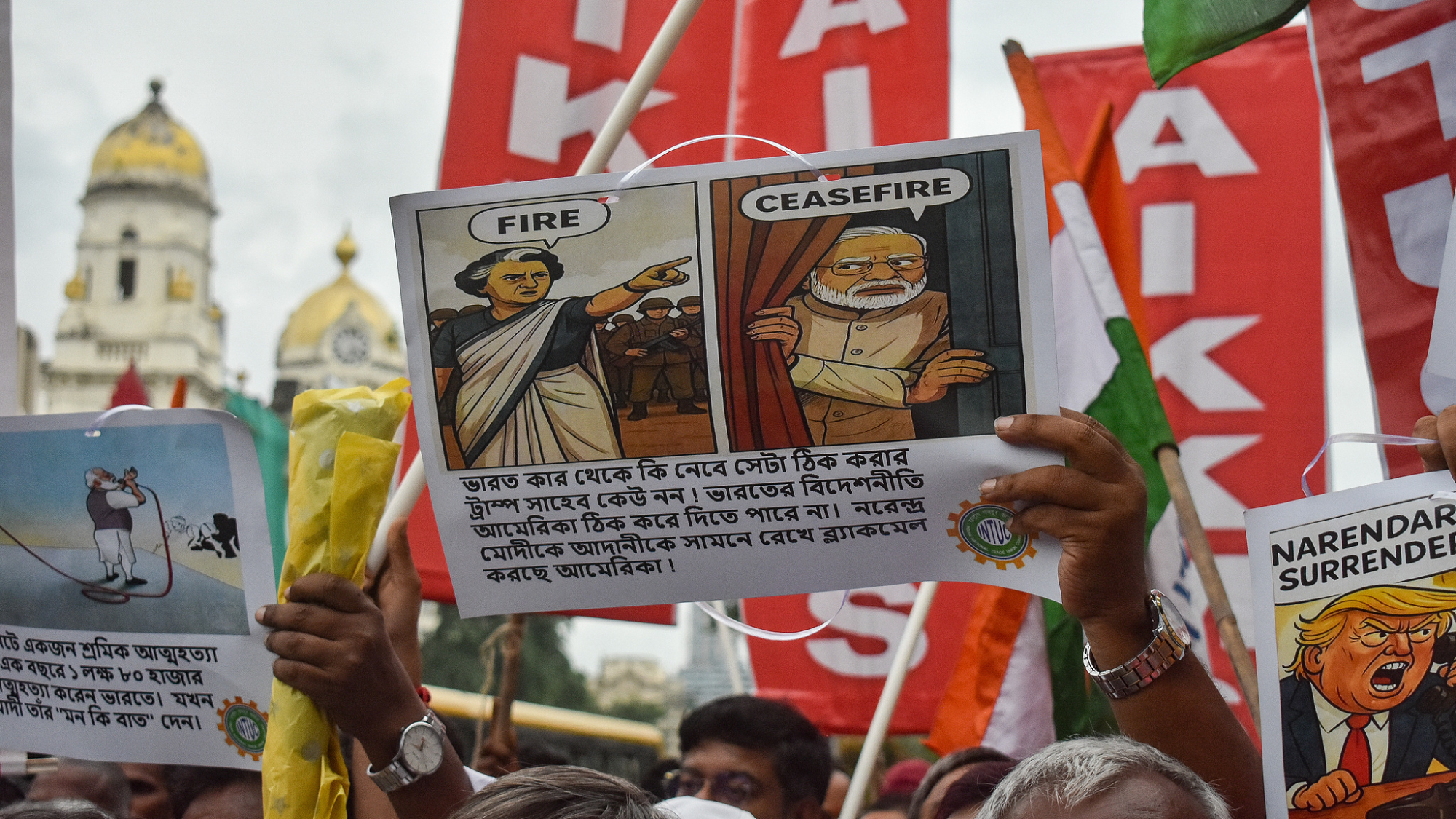 अमेरिकी राष्ट्रपति डोनाल्ड ट्रम्प द्वारा रूस से कच्चा तेल खरीदने पर भारत पर 50% टैरिफ लगाए जाने के बाद, भारतीय ट्रेड यूनियनों ने विरोध रैलियाँ निकालीं और ट्रम्प के पुतले जलाए।