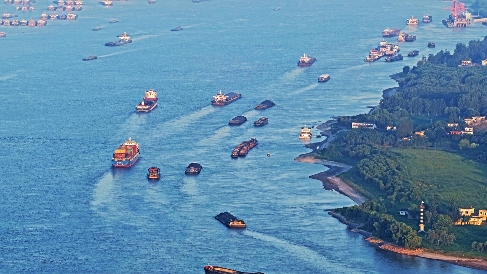 चीन के आनहुई प्रांत के वुहू शहर के जलमार्ग में विभिन्न प्रकार के जहाज़ आगे-पीछे आते-जाते रहते हैं