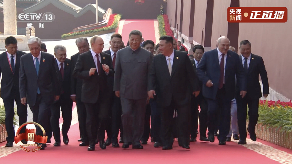 शी चिनफिंग विभिन्न देशों से आए अतिथियों के साथ थिआनमन गेट टॉवर पर चढ़े