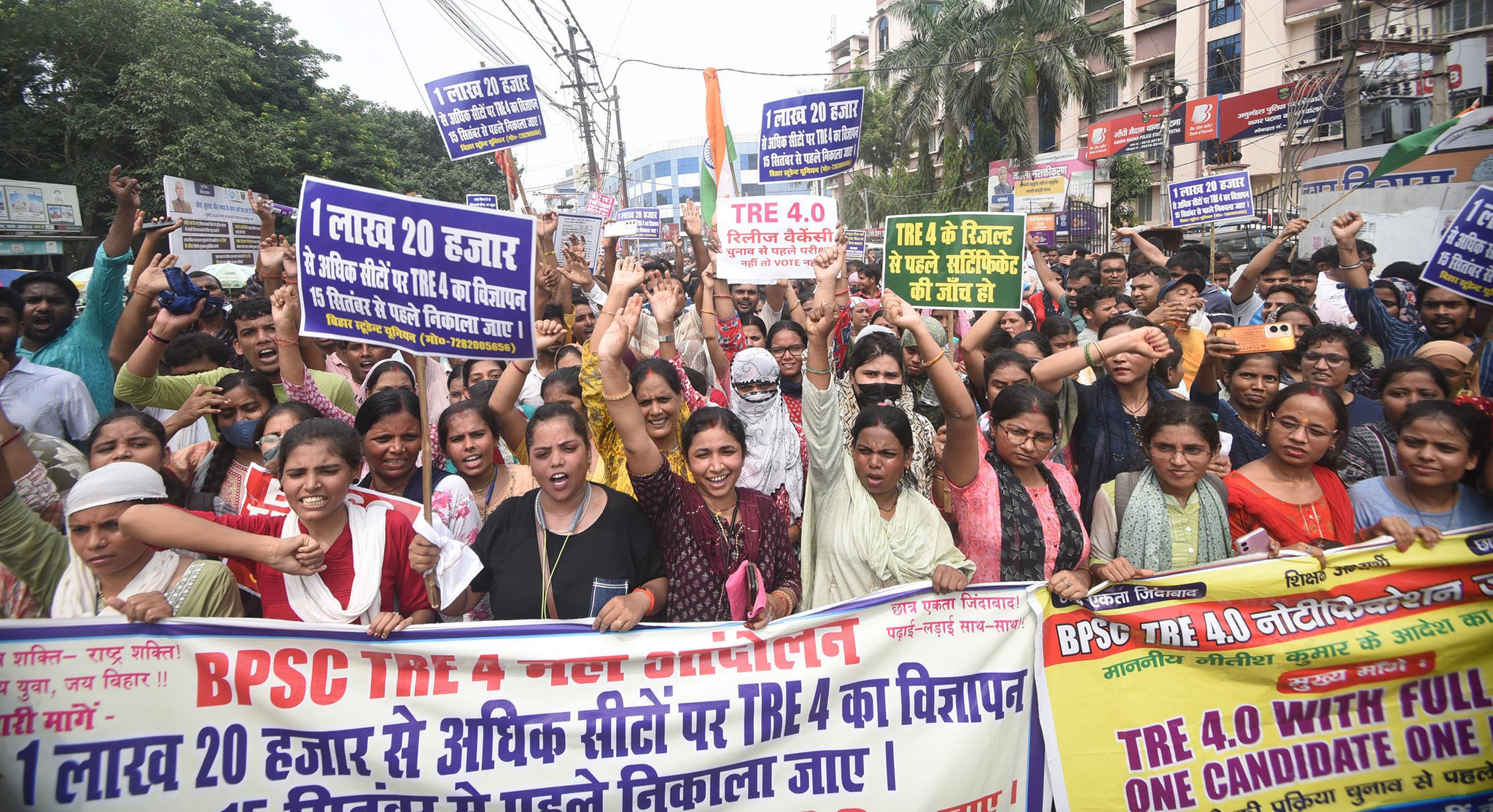 9 सितंबर को, भारत की राजधानी पटना के ढाक बंगला चौराहे पर, बिहार लोक सेवा आयोग (BPSC) शिक्षक भर्ती परीक्षा (TRE) 4.0 के अभ्यर्थियों ने शिक्षक भर्ती परीक्षा (TRE-4) में पदों की संख्या में भारी कटौती के खिलाफ विरोध मार्च निकाला और पुलिस द्वारा लाठियों से पीटा गया।