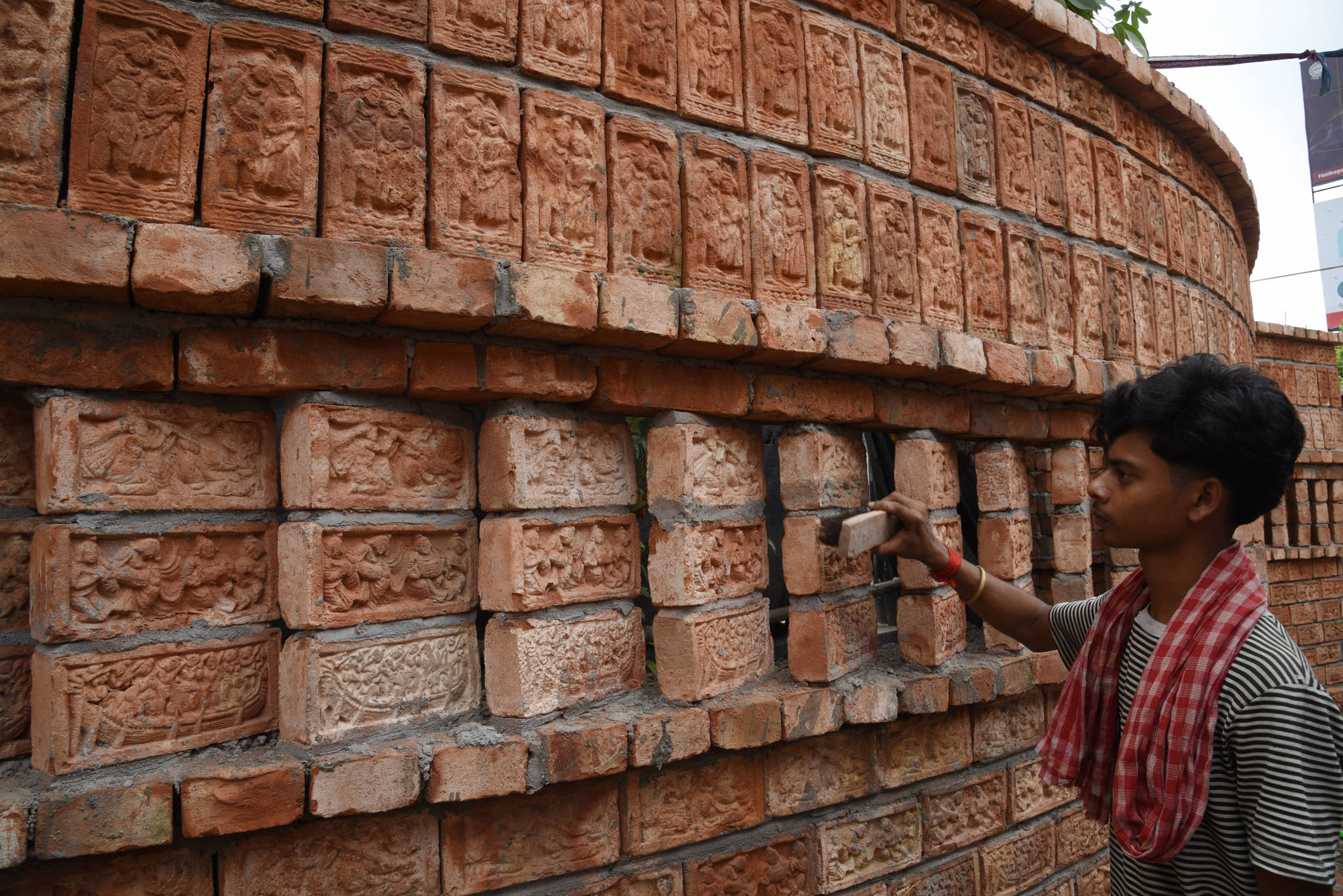 कलाकार मिट्टी की ईंटों को तराशकर हिंदू देवी दुर्गा की मूर्ति को सजा रहे हैं और 9 सितंबर को कोलकाता में होने वाले दुर्गा पूजा उत्सव से पहले 50000 ईंटों का उपयोग करके एक अस्थायी पंडाल तैयार कर रहे हैं। हिंदुओं का सबसे बड़ा त्योहार दुर्गा पूजा, 28 सितंबर से शुरू होकर 2 अक्टूबर तक मनाया जाएगा।