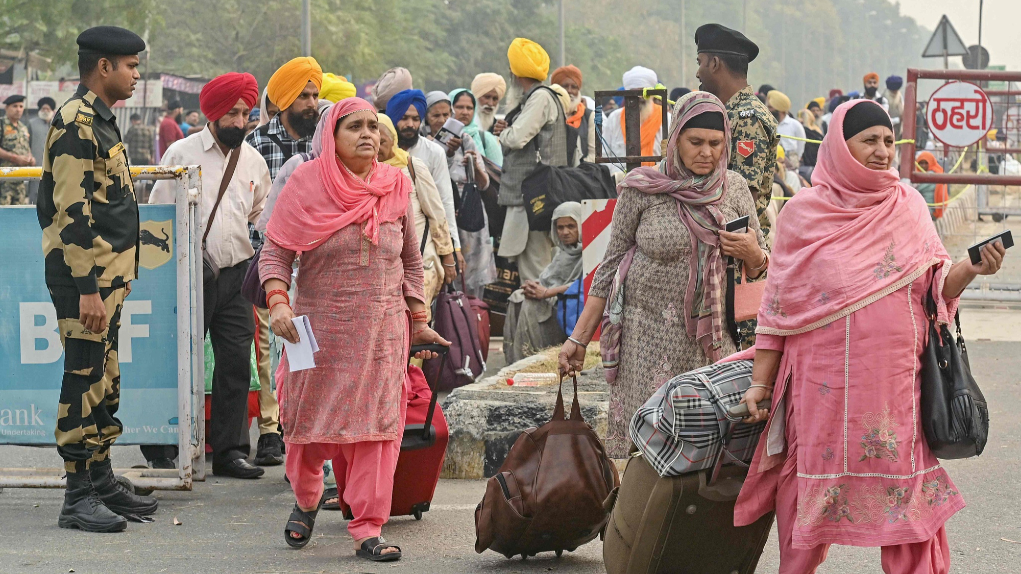 4 नवंबर 2025 को, भारत के वाघा में, भारतीय सीमा सुरक्षा बल के जवान भारत-पाकिस्तान सीमा पर पहरा दे रहे हैं, जहां से भारतीय सिख धर्मावलंबी सिख धर्म के संस्थापक गुरु नानक देव की जयंती के उपलक्ष्य में पाकिस्तान जा रहे हैं। इससे पहले, मई में हुए संघर्ष के कारण भारत और पाकिस्तान के बीच यात्रा स्थगित कर दी गई थी। संघर्ष के बाद से यह पहली बार है जब भारतीय सिख तीर्थयात्री अनुमति प्राप्त कर बड़ी संख्या में पाकिस्तान जा रहे हैं।