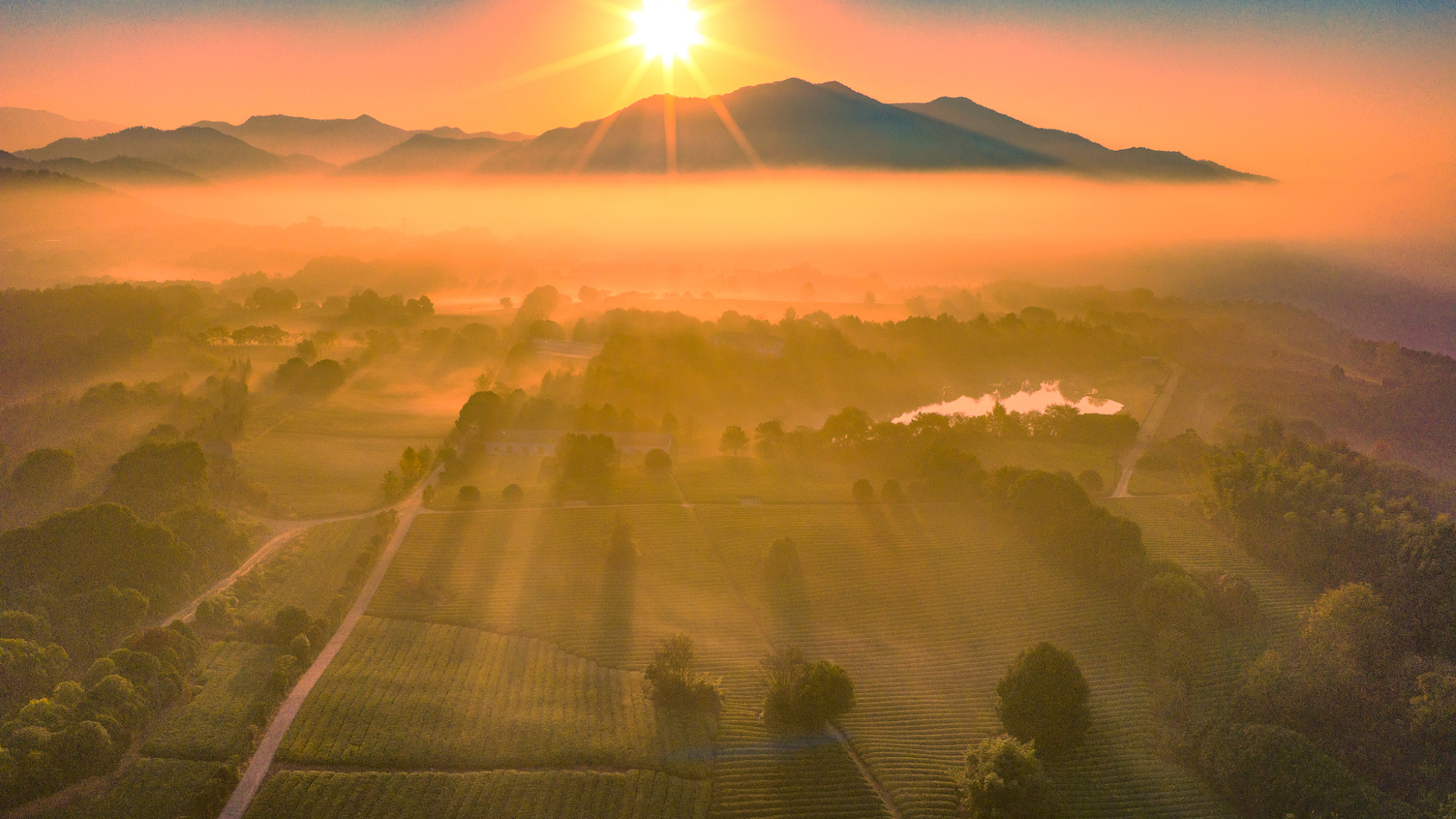 चीन के चच्यांग प्रांत के ग्रामीण क्षेत्र में चाय के बागान हरे-भरे हैं, जो सुबह की धूप में स्याही से बनी पेंटिंग जैसे लगते हैं।