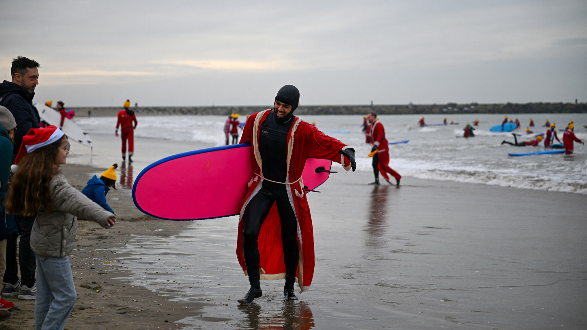 हॉलैंड के हेग शहर में लोग समुद्र के किनारे इकट्ठा होकर सर्दियों की सर्फिंग गतिविधि देख रहे थे। प्रतिभागी क्रिसमस थीम के कपड़े पहने थे और समुद्री तट को त्योहार का दृश्य बना दिया था। यह सालाना आयोजन अपने अद्वितीय खेल और मौसमी उत्सव के संयोजन के लिए प्रसिद्ध है, जो बड़ी संख्या में सर्फर्स और दर्शकों को आकर्षित करता है। मौसम ठंडा होने के बावजूद, घटनास्थल का माहौल बहुत उत्साही था। यह आयोजन अब हॉलैंड के समुद्र के किनारे पर वर्ष के अंत की प्रतीकात्मक परंपरा बन गई है।
