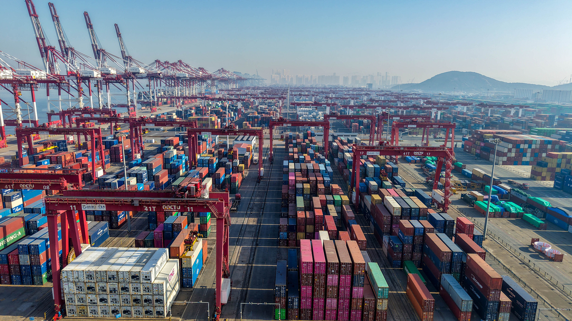 छिंगताओ छियानवान पोर्ट पर कंटेनर जहाज़ों को तेज़ी से लोड और अनलोड किया जा रहा है।