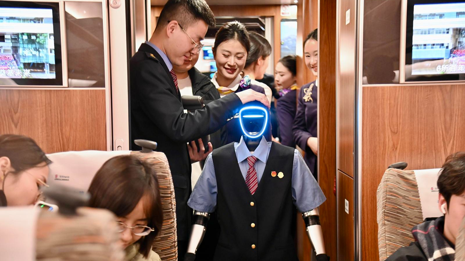 हांगचोउ की "शिज़ी" जी41 ट्रेन में यूनिट्री रोबोटिक्स के रोबोट "ट्रेन अटेंडेंट" यात्रियों का स्वागत करते हैं। ये रोबोट "ट्रेन अटेंडेंट" यात्री डिब्बों में घूमते हुए यात्रियों को नव वर्ष की शुभकामनाएं दे रहे थे।