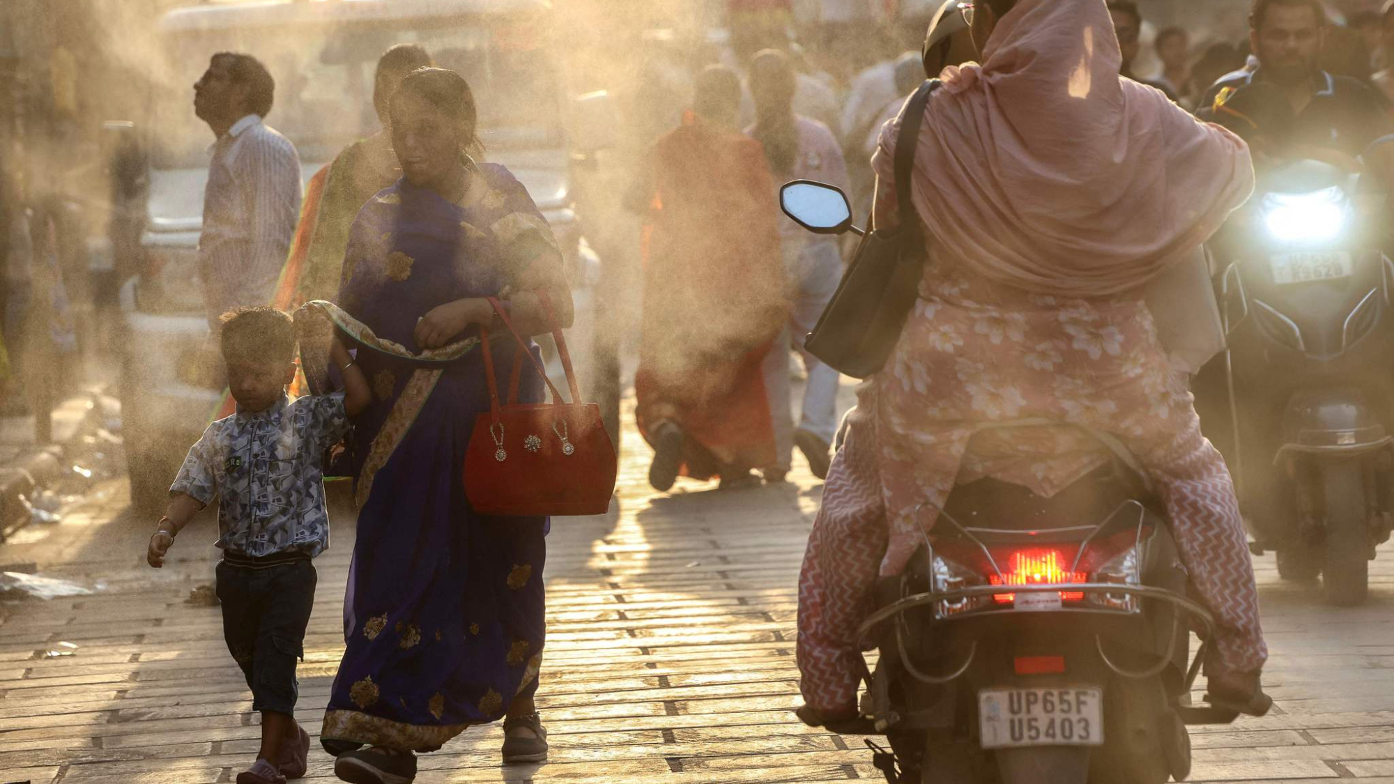 वाराणसी में लोग गर्मी से राहत पाने के लिए सड़कों पर लगे स्प्रिंकलर के नीचे से गुज़रते हुए