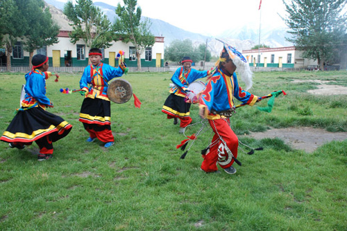 प्राइमरी स्कूल के छात्र तिब्बती नृत्य नाचते हुए